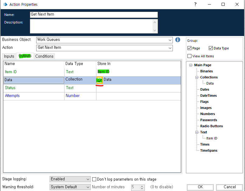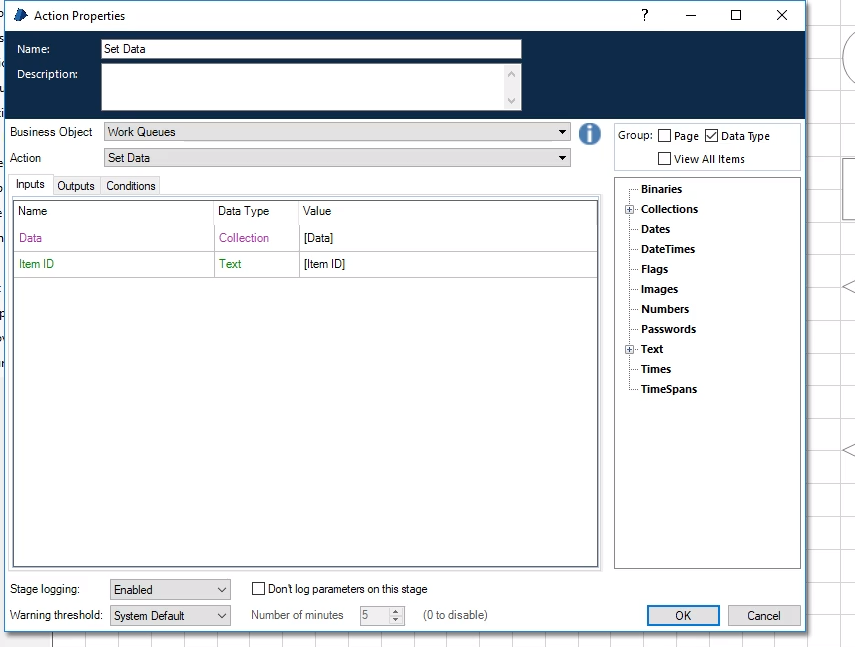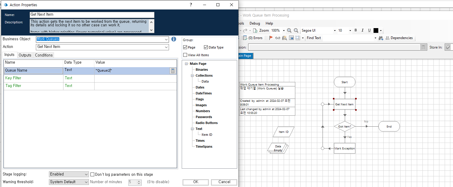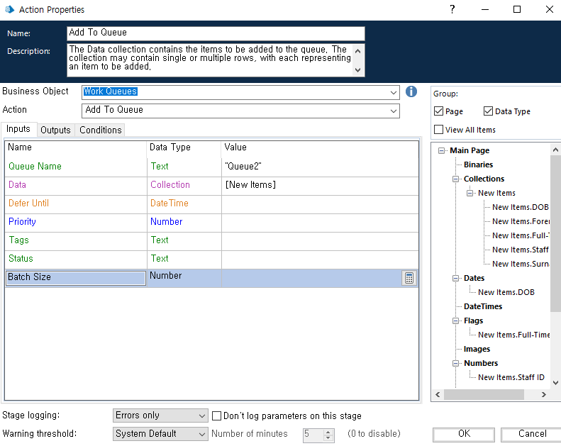 Work Queues 비즈니스 객체의 Set Data 액션은 컬렉션의 각 항목의 변경을 작업 대기열에 다시 저장한다.