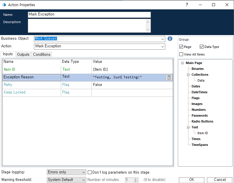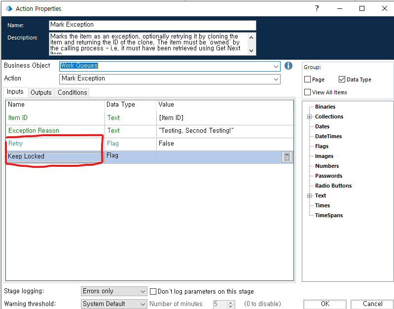 Exception Reason에 대한 값을 입력하고 Retry 값에 False를 입력 >