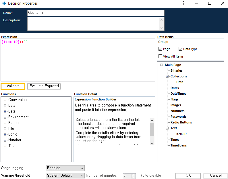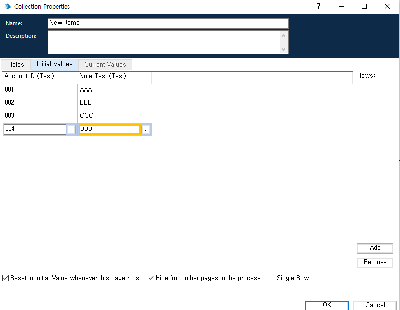 Collection Stage 값은 표현식이 아니므로 텍스트 값에 따옴표가 필요하지 않는다.