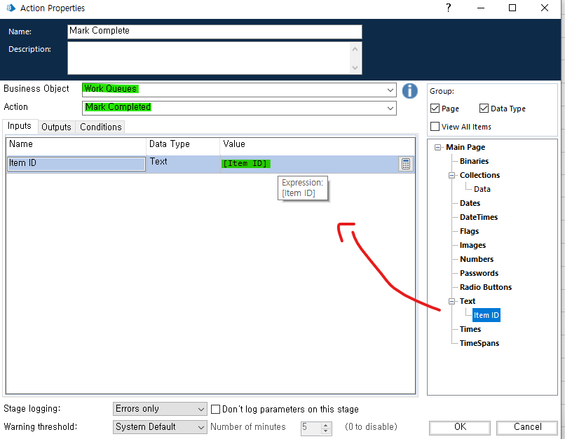 액션 속성에서 Work Queues 비즈니스 객체의 Mark Completed 액션 선택 >