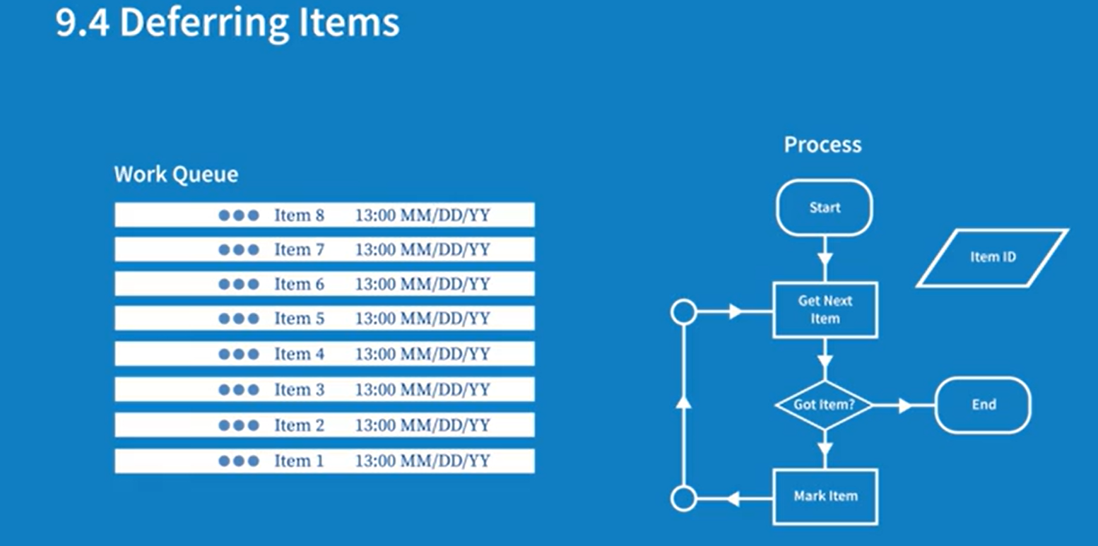 항목 생성시 연기 날짜를 지정하면 작업 대기열은 해당 날짜까지 항목을 보류하고 효과적으로 동결한다. 따라서 작업 대기열에서 작업 중인 프로세스가 더이상 항목을 검색하지 못한다고 해도 반드시 대기열에 처리해야 할 항목이 없는 것은 아니다.