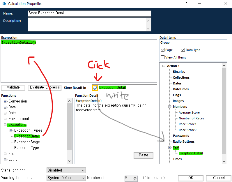 복구모드 내에 계산 스테이지를 설정 > 데이터 항목 내에 예외 세부 정보를 저장