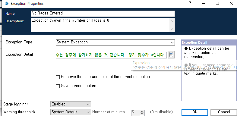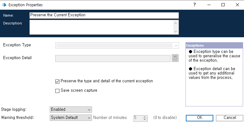 보존 상자를 선택하면 Exception Type 필드와 Exception Detail 필드가 비활성화된다.