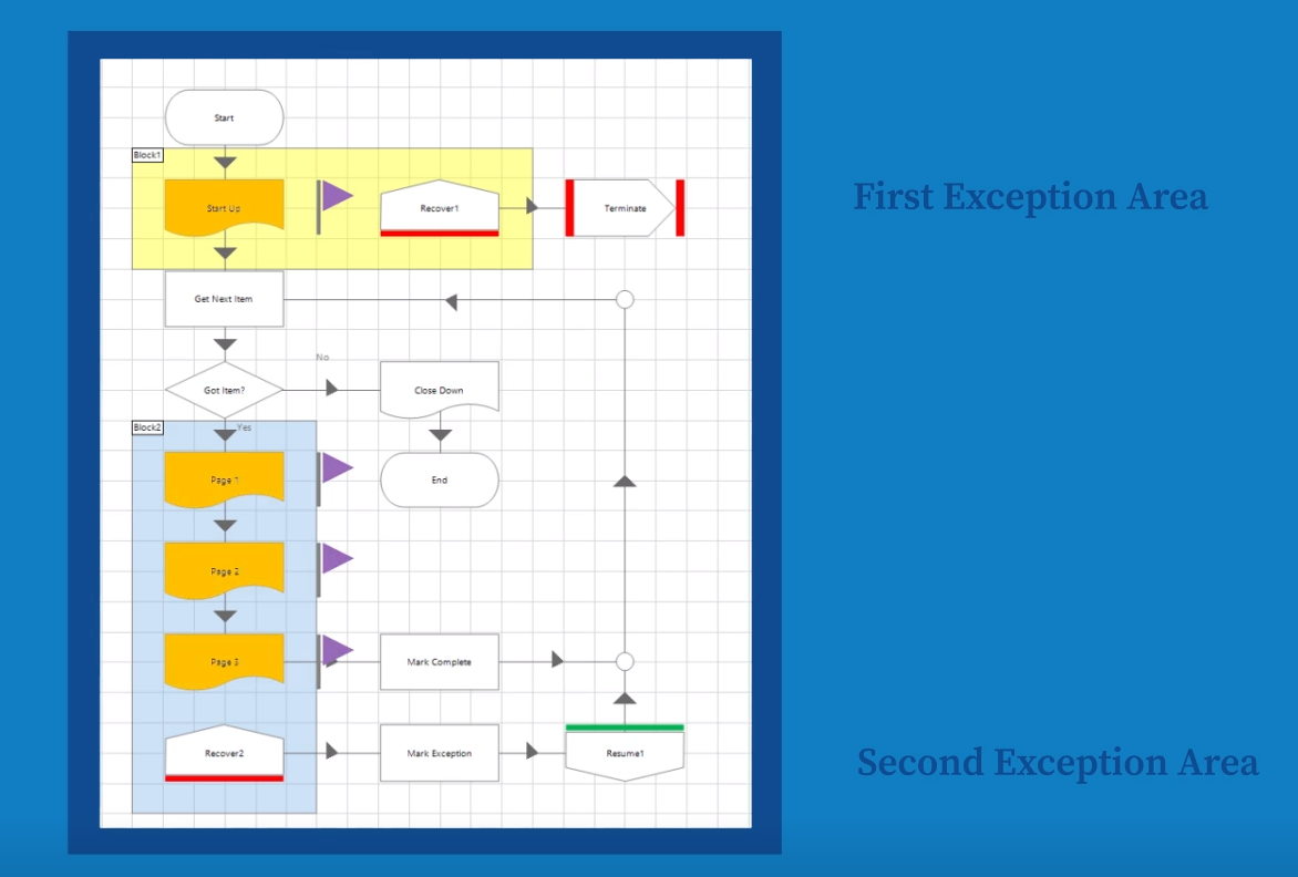 오류를 식별하기 어려운 경우를 대비해 예외 스테이지를 프로세스 솔루션 전반에 걸쳐서 포함시킬 수 있다.