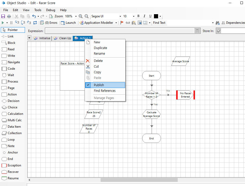 1.1 Races Score 비즈니스 객체를 열어서 복구로직 제거 후 액션페이지 게시하고 저장