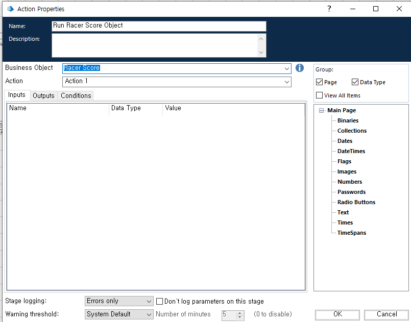 1.2 New Racer Scores 프로세스 생성 후 액션 스테이지 추가