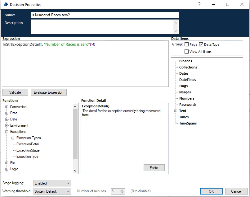 Functions의 Exceptions> Exception Detail 을 표현식에 드래그 앤 드랍