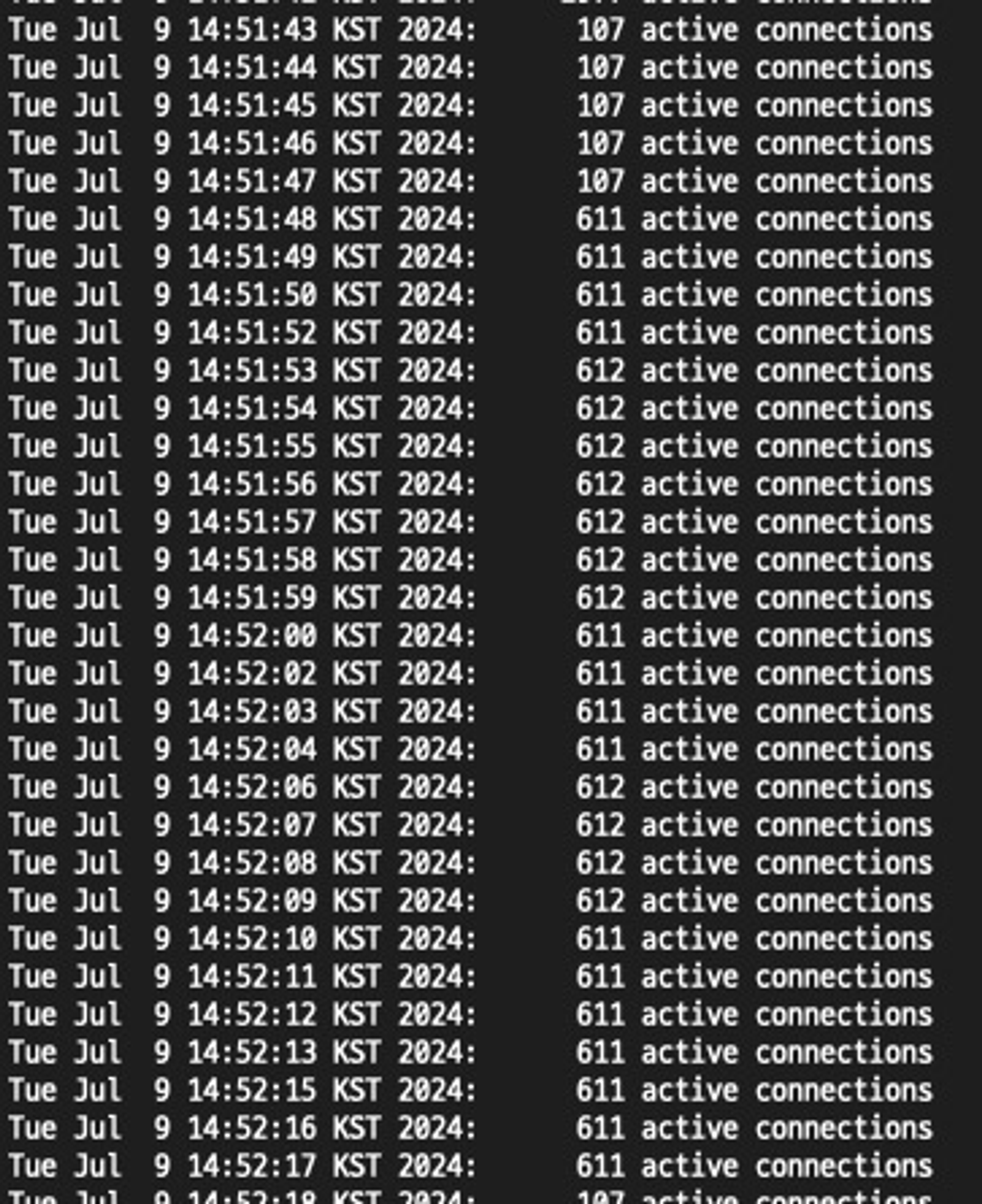 추가로, 실시간 연결 수 다음과 같이 모니터링을 위한 스크립트를 사용해 테스트 중 시스템 상태를 지속적으로 관찰했습니다.