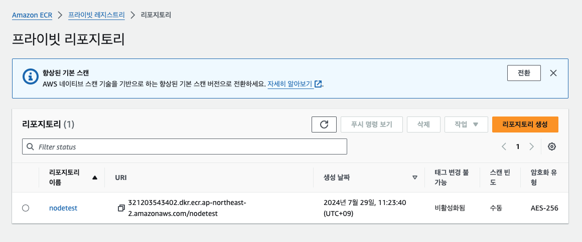 • ECR에 nodetest로 repository 생성