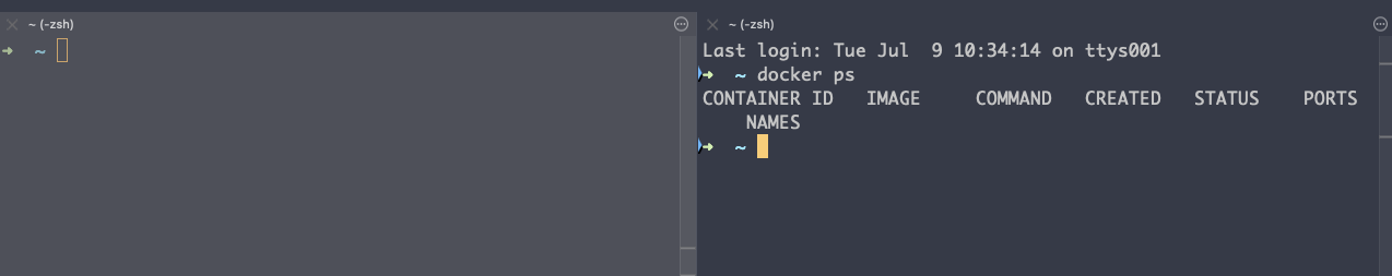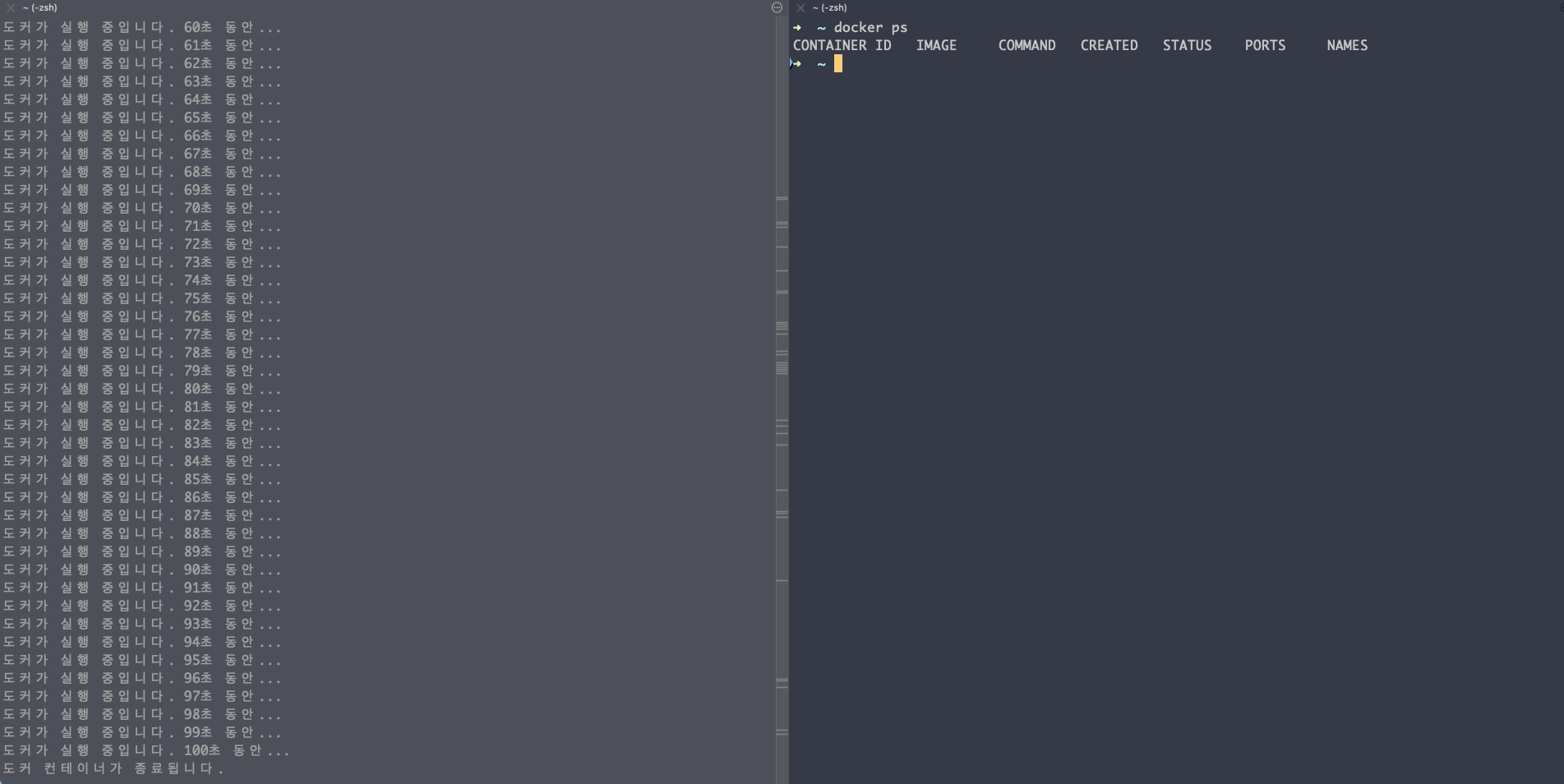실행을 마치고 종료하면 실행중인 컨테이너가 없으므로 아무것도 안보이게 된다.