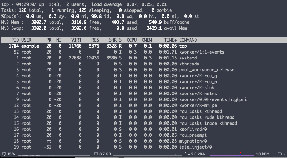 top 명령어 이용해서 시스템 상태 모니터링, 실행중인 프로세스와 시스템 자원 사용률 등이 보인다. q를 눌러서 나간다.