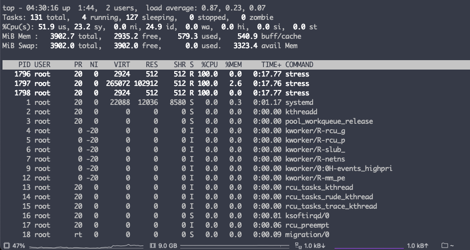 하단 사진을 보면 cpu 부하가 stress 프로세스에 의해 증가한 것을 확인할 수 있다.