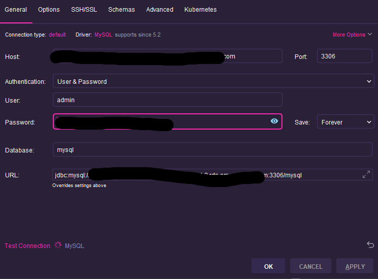 Password ; 초기에 RDS 생성시 만들었던 비밀번호 입력