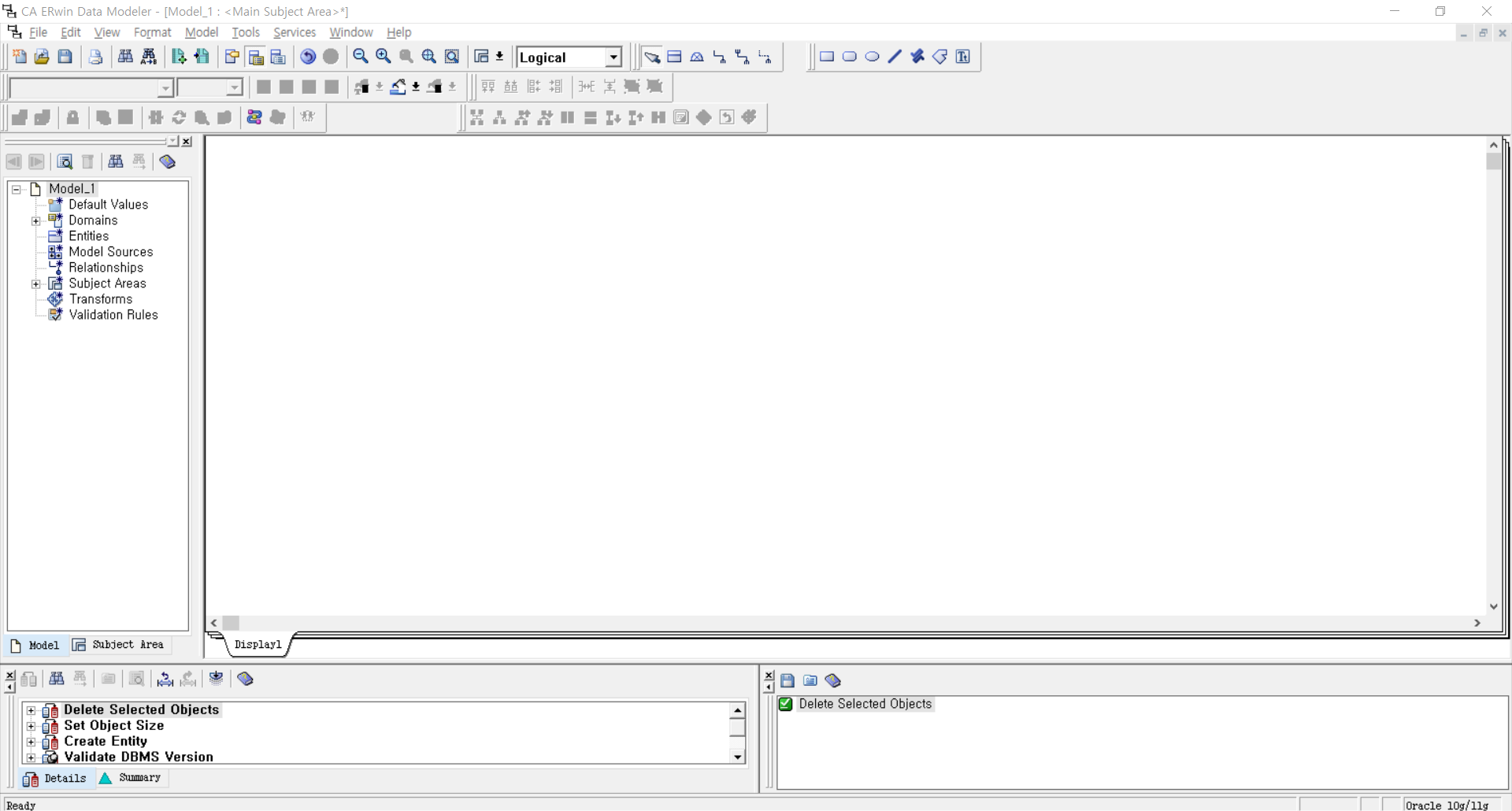 file 밑의 아이콘을 눌러, Create Model 창을 띄운뒤, 새롭게 생성할 모델의 논리적/물리적 설계를 위해 Logical/Physical 부분에 체크를 해준다. 그리고, 해당 모델의 Target Database를 지정해준다. 이 사진에서는 Oracle로 지정.