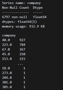 company열도 float type이다. 이것도 회사 코드인듯. 회사 코드가 많이 들어가지 않은 것 보니 단발성으로 오는 일반 회사인 것 같다. 호텔에서 일해보니 FIT, 일반사, 제휴사 별로 특징이 많이 다르다.