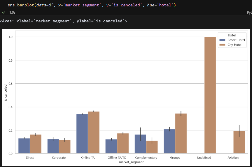 segment별로 데이터프레임을 따로 만들었다. 아까 그래프 중에 segment 그래프가 있었는데, Groups와 Online TA 비중이 가장 높았다. 그래도 Groups, Corporate, Direct, Online TA 이렇게 4개 정도는 확인해 보자!