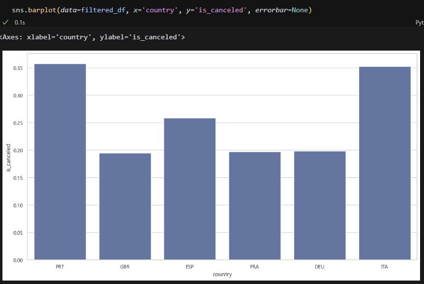 예약 취소에 대한 일차적인 원인 파악은 어느정도 된 거 같은데요, 왜 이런 결과가 나왔는지에 대한 데이터 분석을 해보면 좋을 거 같아요! 그 원인이 어떻게 일어났는지, 그 원인을 발생시킨 주요 군집은 어디인지 등 계속 꼬리를 무는거죠. 예를 들어 PRT 국가는 데이터의 개수가 많은데도 불구하고 다른 나라보다 취소율이 확연히 높은 것을 알 수 있는데요, 왜 PRT국가가 다른 나라보다 취소율이 높을까? 라는 질문에 대한 데이터 분석도 해보는 것을 추천드려요!