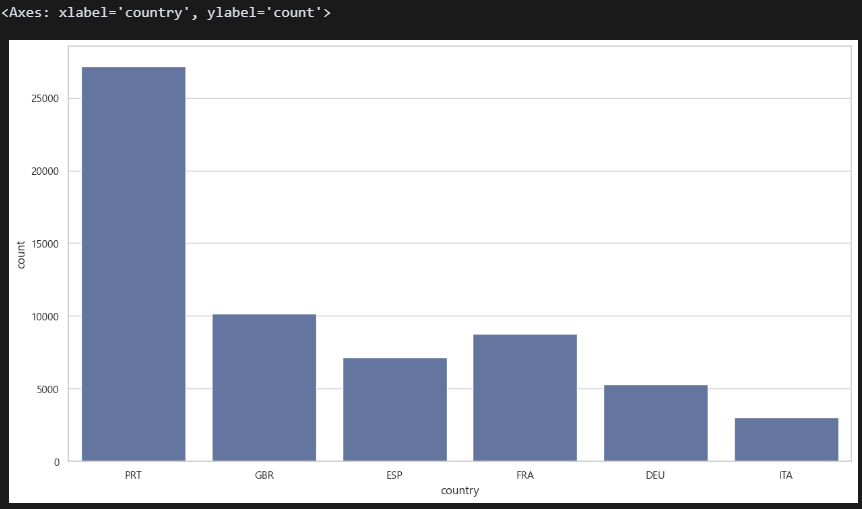 예약 건수가 많은 상위 6개 국가만 추렸다. 어떻게 해야할지 몰라서 도움을 좀 받았음. 특정 수량을 조건으로 건 변수를 만들고 isin()로 필터를 걸면 되는 것 같다. 포르투갈 예약 건수가 제일 많다. 아마도 이 호텔이 포르투갈에 있는 것 같음.