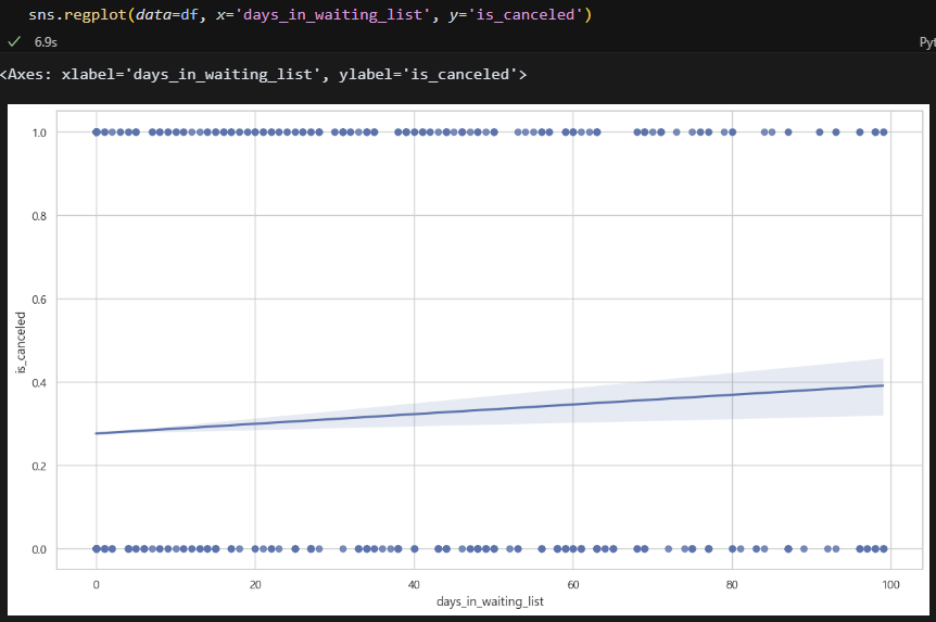회귀선을 그어보니 확실히 예약 후 시간이 오래 지날수록 취소율이 높아지는 것 같다. 예약 후 140일 정도 지나면 대부분 취소하는 것 같음.