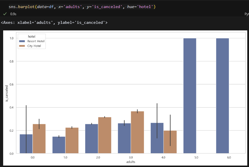 투숙객 5명 이상은 전부 취소인 것을 알 수 있다. 예약을 잘못해서 취소했나? 그 다음은 3명일 때가 취소율이 높다. 그다지 큰 연관은 없어보이나, 굳이 따지자면 투숙객 3명을 붙잡을 수 있는 프로모션을 하면 취소율이 낮아질 것 같다.