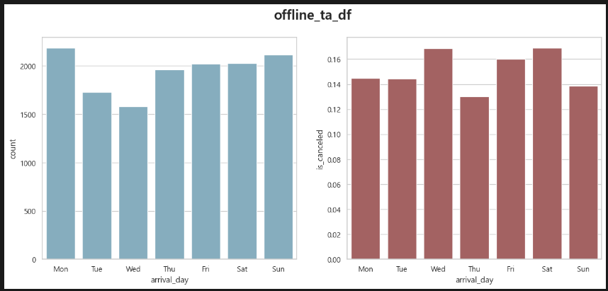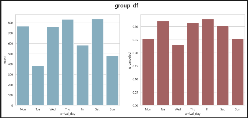 다음은 요일 별로 볼 차례다. 내 생각에는 금토 취소율이 높을 것 같다. 보통 여행은 금토로 잡고 가니까.