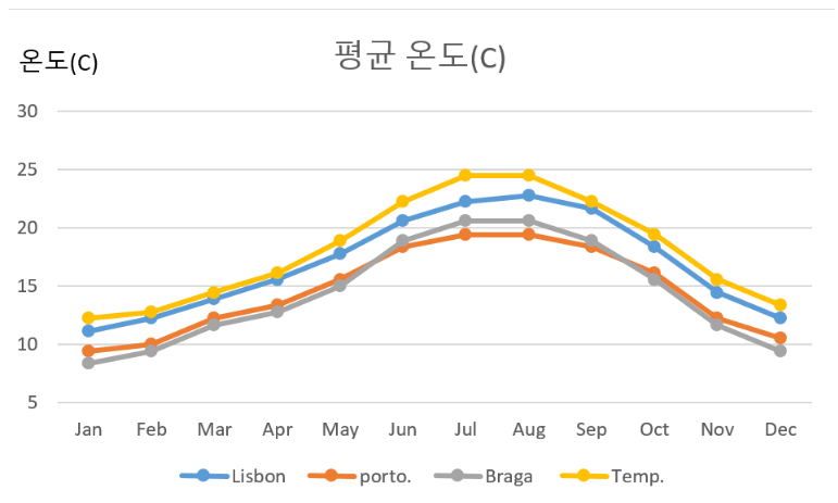 다른 사이트에서 포르투갈 평균 온도를 찾아보니 역시나 7월 8월이 한여름이었다. 여름 성수기에 미어터지는 건 어느 호텔이나 만찬가지인 것 같다.