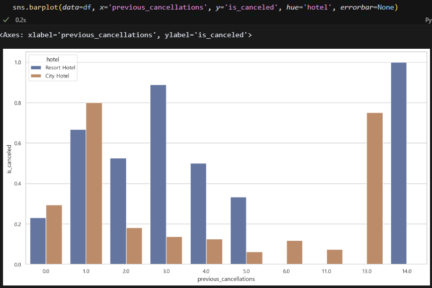 errorbar가 거슬려서 삭제했음. 취소 이력이 있는 고객의 취소율이 더 높다. 근데 이력이 많아질 수록 취소율이 낮아진다. 흠,, 딱히 관계는 없는 듯.