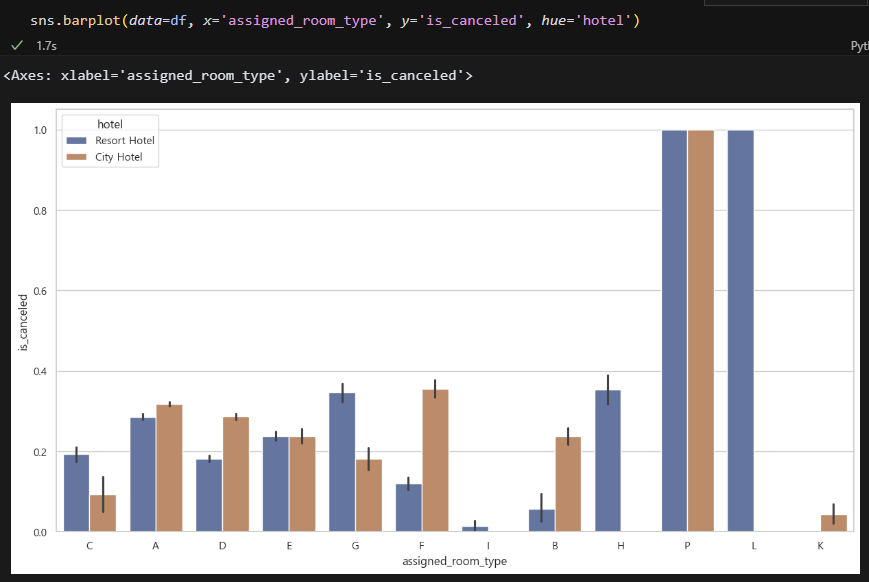 실제 어싸인된 객실 그래프다. 부킹객실과 어싸인객실은 다를 수 있다. 가끔 오버부킹 때문에 객실을 바꿔주는 경우가 있어서 그렇다. 근데 P타입 L타입 객실 취소율이 작살난 상태다. 도대체 무슨 객실인 걸까? 어쨋든 이 객실은 개선이 필요함.