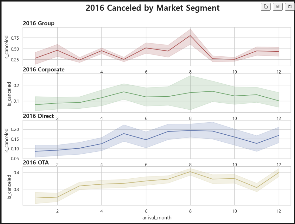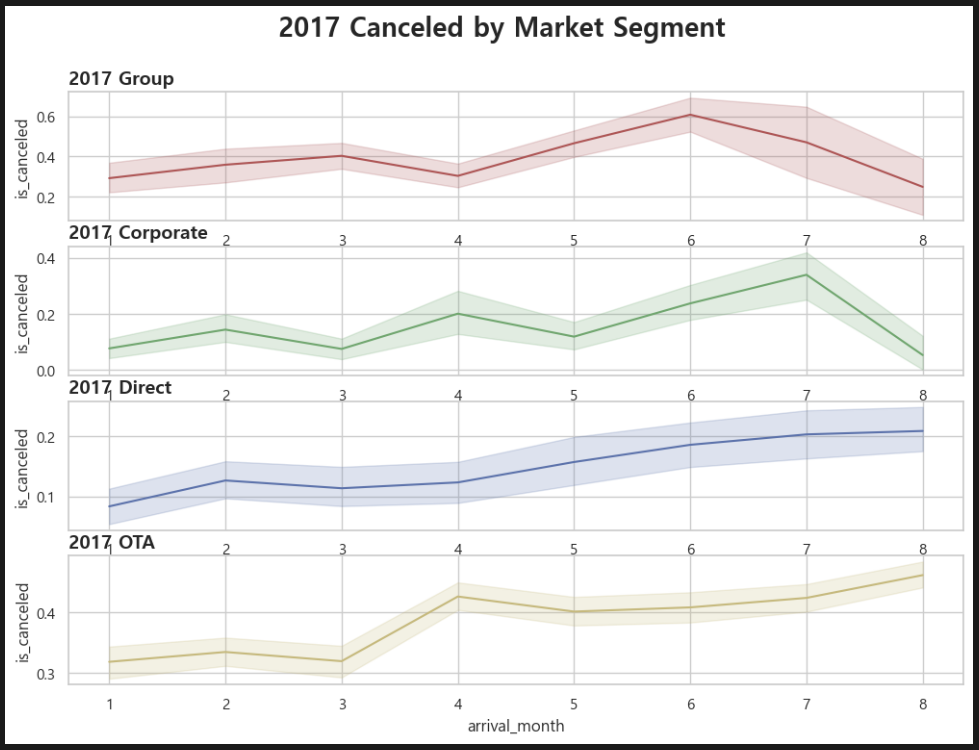 오늘의 결론 또한 어제와 같다. 이 호텔이 취소율을 낮추어 매출을 높이기 위해서는, OTA 예약 건과 단체행사 예약 건에 대한 취소 규정을 다소 조정할 필요가 있다.
