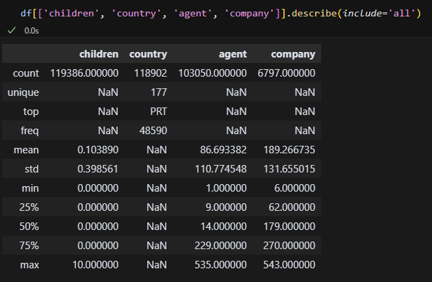 그리고 결측값이 존재하는 각 열마다 수치인지 문자인지 확인한다. 오 근데 이렇게는 처음 해본다. 원래 df.describe()로 모든 열을 봤는데, 내가 보고 싶은 열을 지정할 수도 있는 것 같다. 또 하나 배웠다.