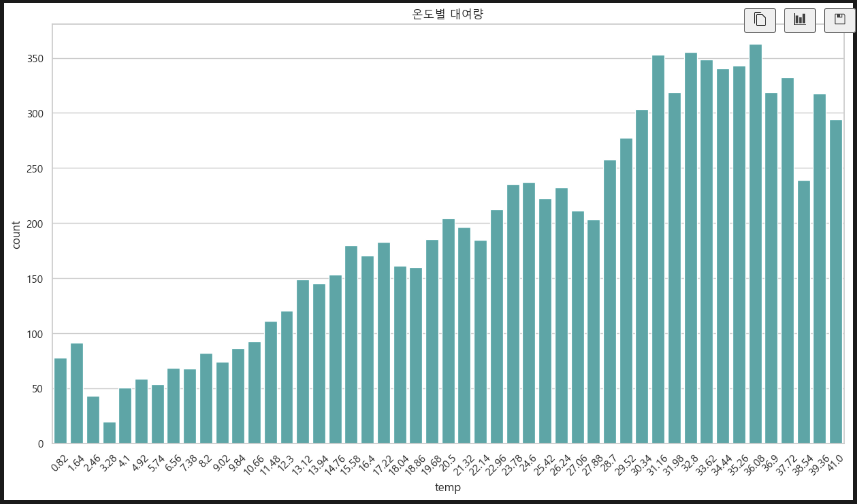 기온(섭씨)에 따른 대여량 비교. 30~37도 정도에 대여량이 많다.