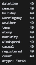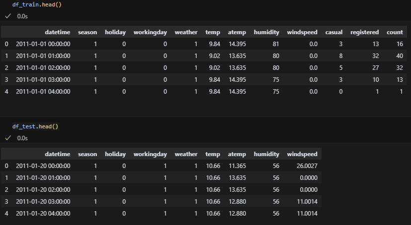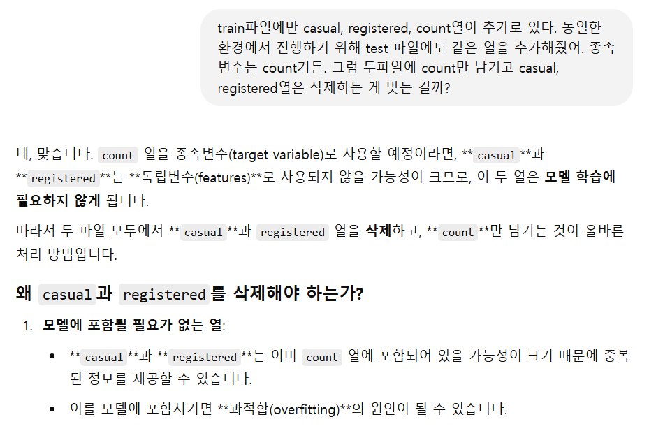 train파일에만 casual, registered, count열이 추가로 있다. 동일한 환경에서 진행하기 위해 test 파일에도 같은 열을 추가해줘야겠다.