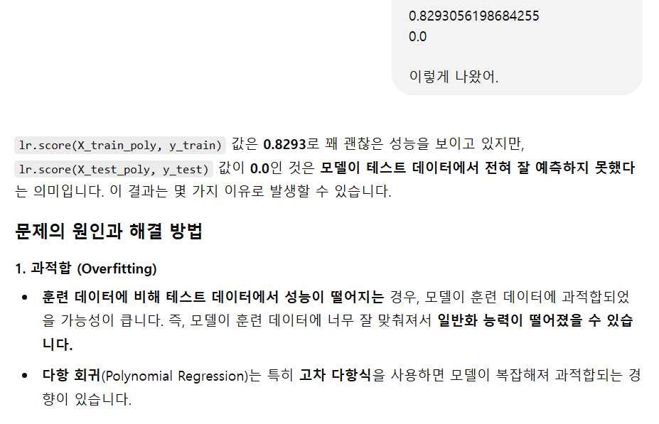 X_train_poly와 X_test_poly를 예측하는 코드를 넣었다. 스코어 함수를 사용했는데 위 처럼 나왔다. 이건 망했다는 뜻이겠지? train셋은 1.0점인데, test셋은 0.0점이다.