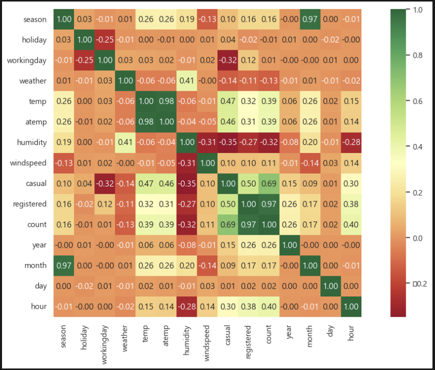 히트맵으로 보니 count와 눈에 띄게 상관관계가 있는 것이 몇 보인다.