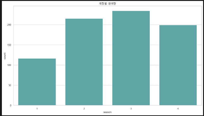 계절에 따른 대여량. 1분기(봄)엔 대여량이 적고 그 외 대여량이 약 2배 높다.