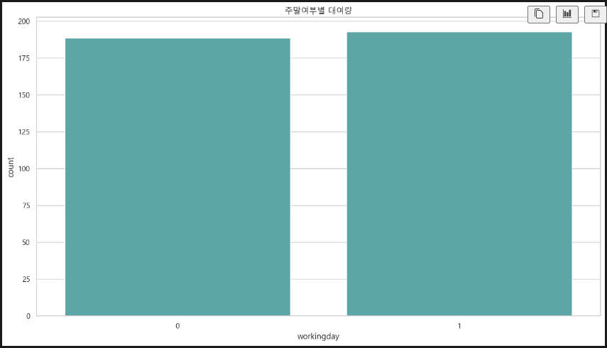 주중 주말 대여량에는 큰 차이가 없다. 신기하다. 주말이 훨씬 많을 줄 알았는데... 아마도 평일이 day off인 사람도 있어서 그런 게 아닐까 싶다.