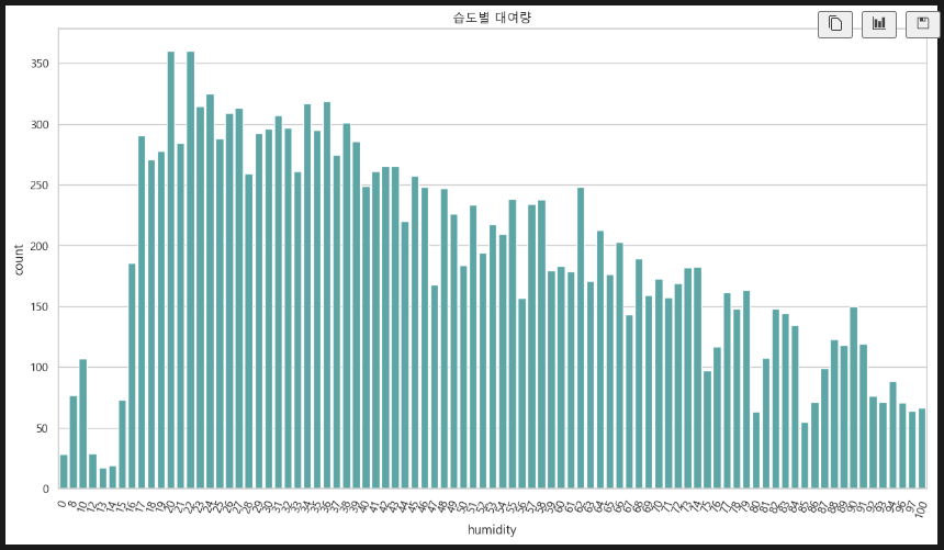 습도에 따른 대여량. 습도 20~40% 정도에 대여량이 많다.