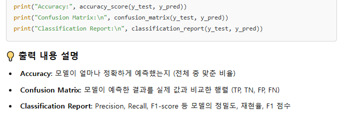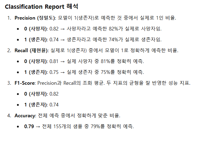 train셋과 test셋 정확도를 보기 위해 y_pred_train 변수를 만들어 줬다. 강의 때 배운 오차행렬부터 precision, recall, f1-score 점수까지 싹 다 나온다.