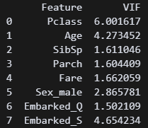 pd.DataFrame(X.columns, columns=["Feature"])["VIF"] = [variance_inflation_factor(X.values, i) for i in range(X.shape[1])]