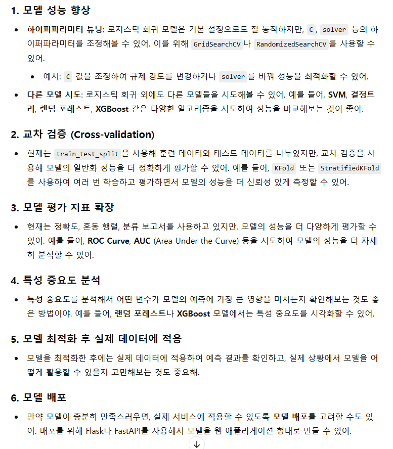 아! 그래 들어봤다. 하이퍼 파라미터!! 그리드 서치와 교차 검증도 이 단계에서 하는 거였구만? 일단 모델 구현이 먼저니까 모델 성능 향상하는 부분은 실력을 더 쌓아서 시도해 봐야겠다.