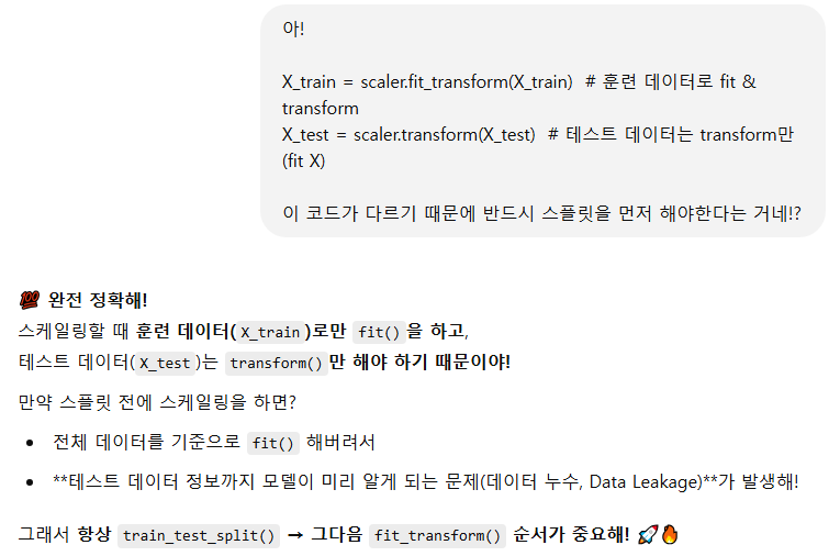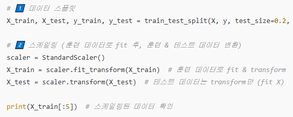 훈련 데이터는 학습(fit)까지 해야하기 때문에 scaler.fit_transform(X_train) 이 코드를 사용해야 한다.