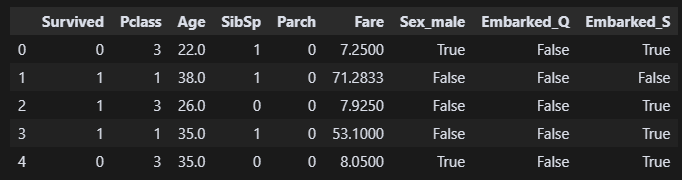 'Sex', 'Embarked' 두 컬럼에 대해 원핫인코딩을 진행했다. drop_first=True 이 코드를 추가하면 자동으로 필요없는 열을 삭제해서 다중공선성을 없애준다고 한다.