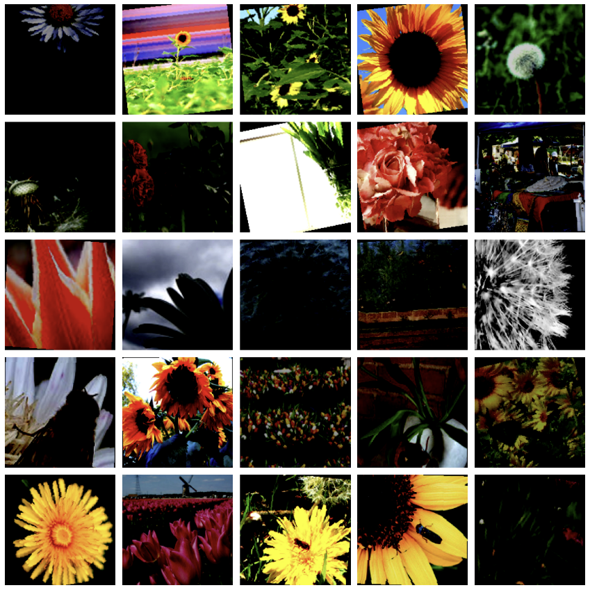 visualize_augmented_grid('data/flower_photos', transforms_train, n_rows=5, n_cols=5)