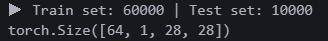 트레인셋 6만 개, 테스트셋 1만 개. 1채널, 28x28 픽셀. 배치는 64로 했다.