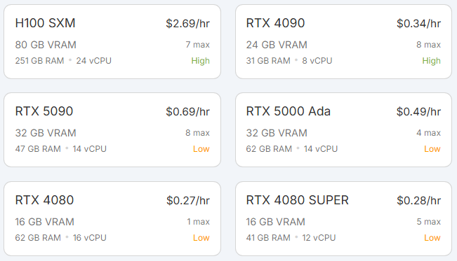 생각보다 GPU 종류가 많다. 한 30개 정도 있네. 시간당 0.2달러 쪽에도 쓸만한 게 많이 보인다.