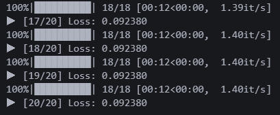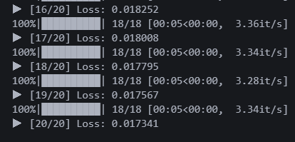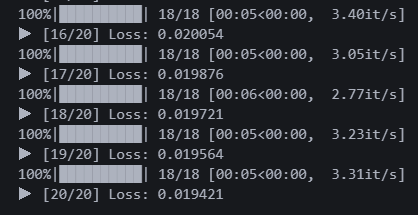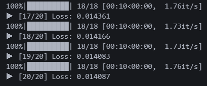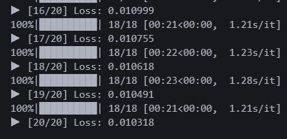어쩐 일로 에러없이 돌아간다. 괜히 더 불안하네. 일단 20에폭 돌렸다. 로스는 0.010이다. 전 모델보다 0.004 감소했다.