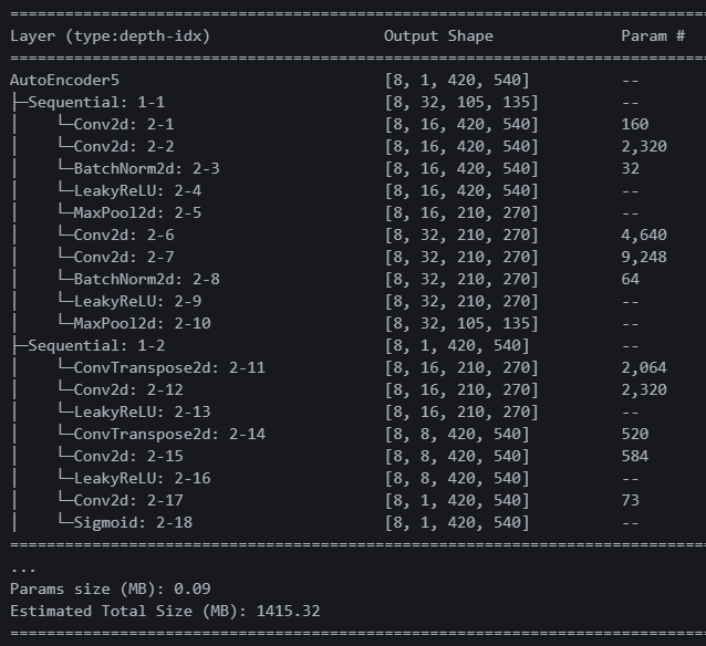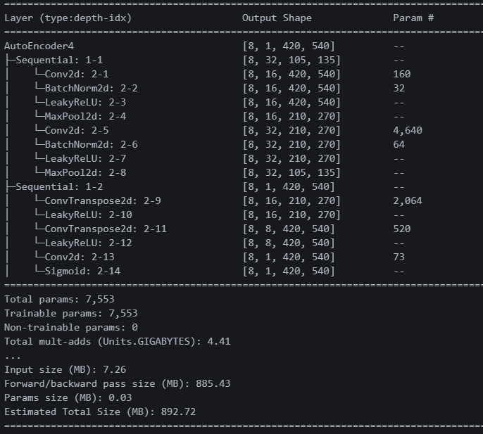 네 번째 모델이다. 인코더 각 레이어마다 배치놈 정규화를 넣었다. 디코더 마지막에 채널을 한 번 더 모아주기 위해 Conv2d 레이어를 넣었다.