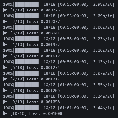 시간이 오래 걸려서 10에폭만 돌렸는데 로스가 0.001이다.
