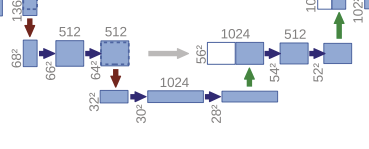 그후 업샘플링 레이어와 다운샘플링 레이어를 채널이 같은 것끼리 concatenate하고, conv레이어를 2회 통과시킨다.