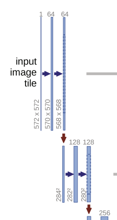 각 단계마다 conv(3x3) 2회 + maxpool(2x2) 1회씩 하며 내려간다. 인풋 사이즈가 572인데, 채널 수는 64로 동일하고 이미지 사이즈만 레이어 1개당 2씩 줄어든다.